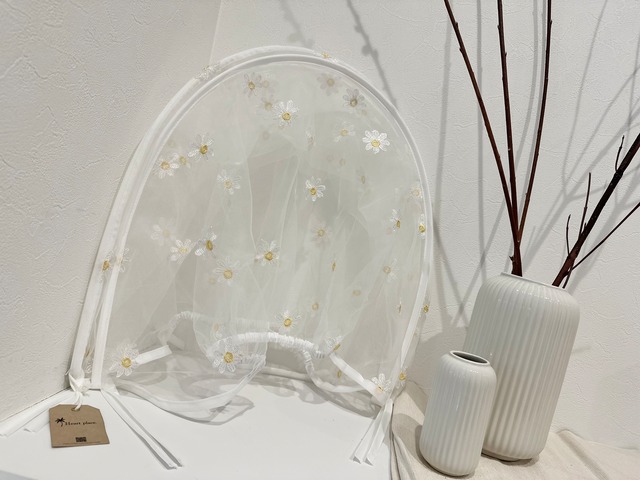 ペットカートに装着するDAISY柄シェード* 飛び出し防止、虫除けや、暑さ対策に。 キュートな花柄の刺繍が施されたカート用のシェードです。 ワンちゃんとのお食事やお買い物中。 どうしてもカートを閉じていたい時に。 通気性が良く、暑い場所でもワンちゃんが快適に過ごせます。 また、中の様子が見えるのも安心◎ サイズ: cm(約) フリーサイズ:40*80 ※ カートに固定できる紐が6箇所に付いています。 伸縮も効くため、ほとんどの機種に対応可能。(ベビーカーも可) 使用しない場合はコンパクトに折りたためるため、持ち運びにも便利です:) ※即納可能