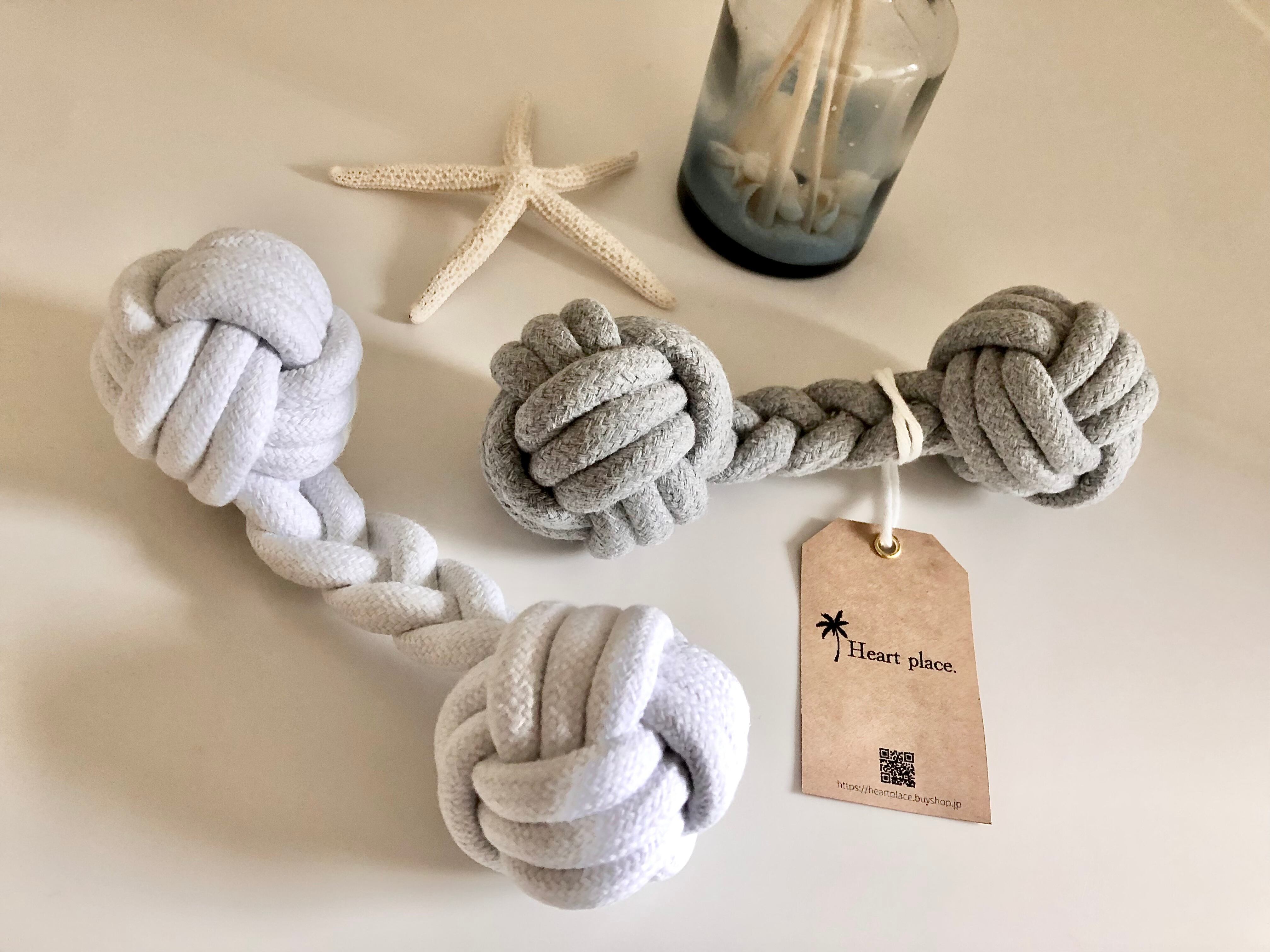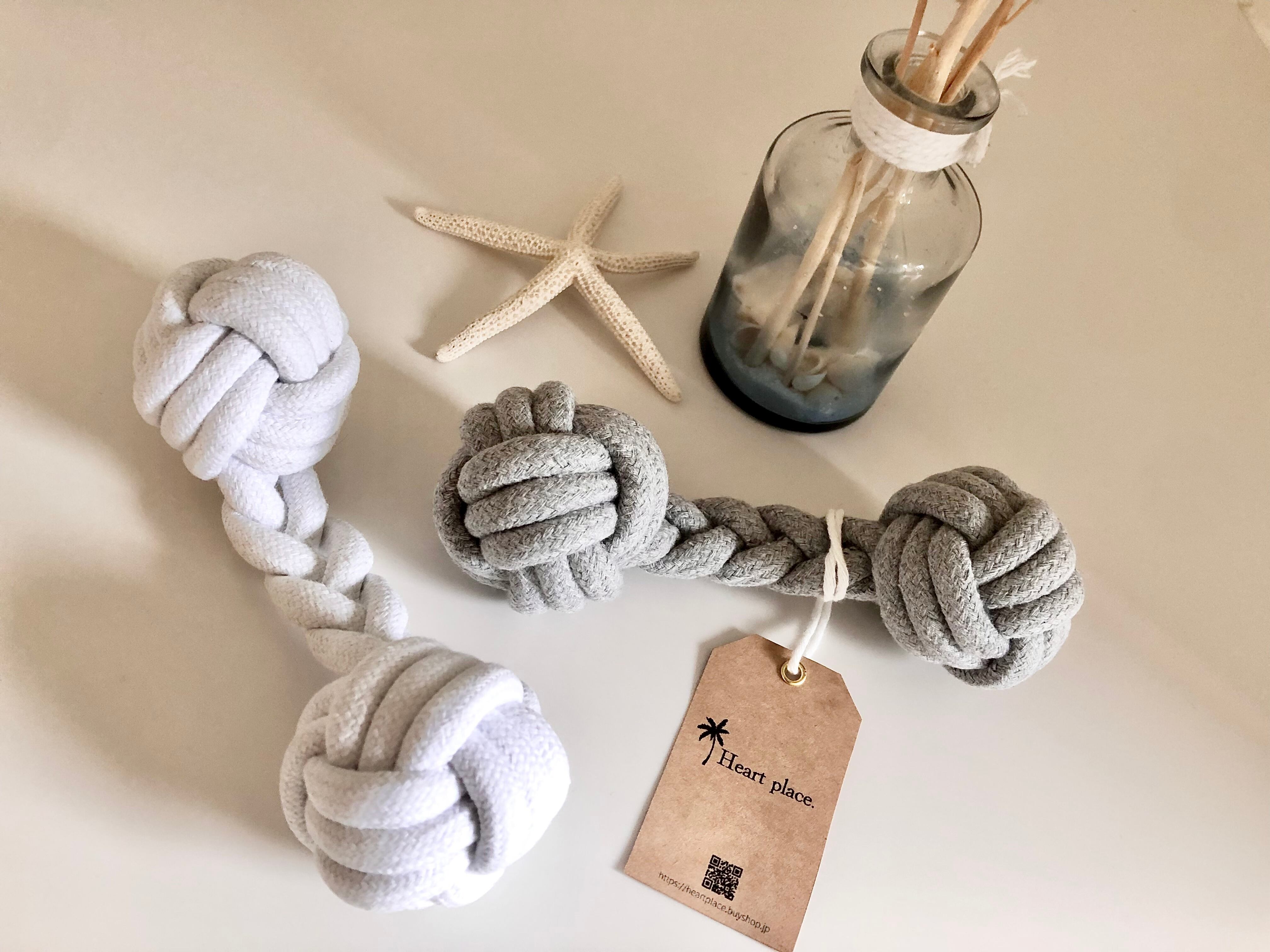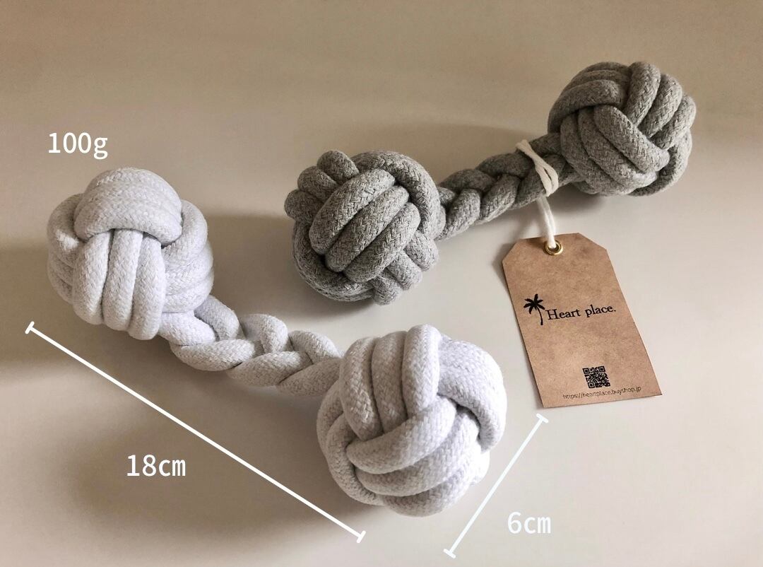 歯磨きや、レトリーブの練習、引っ張りっ子など様々な使い方のできる形状のロープトイです。
