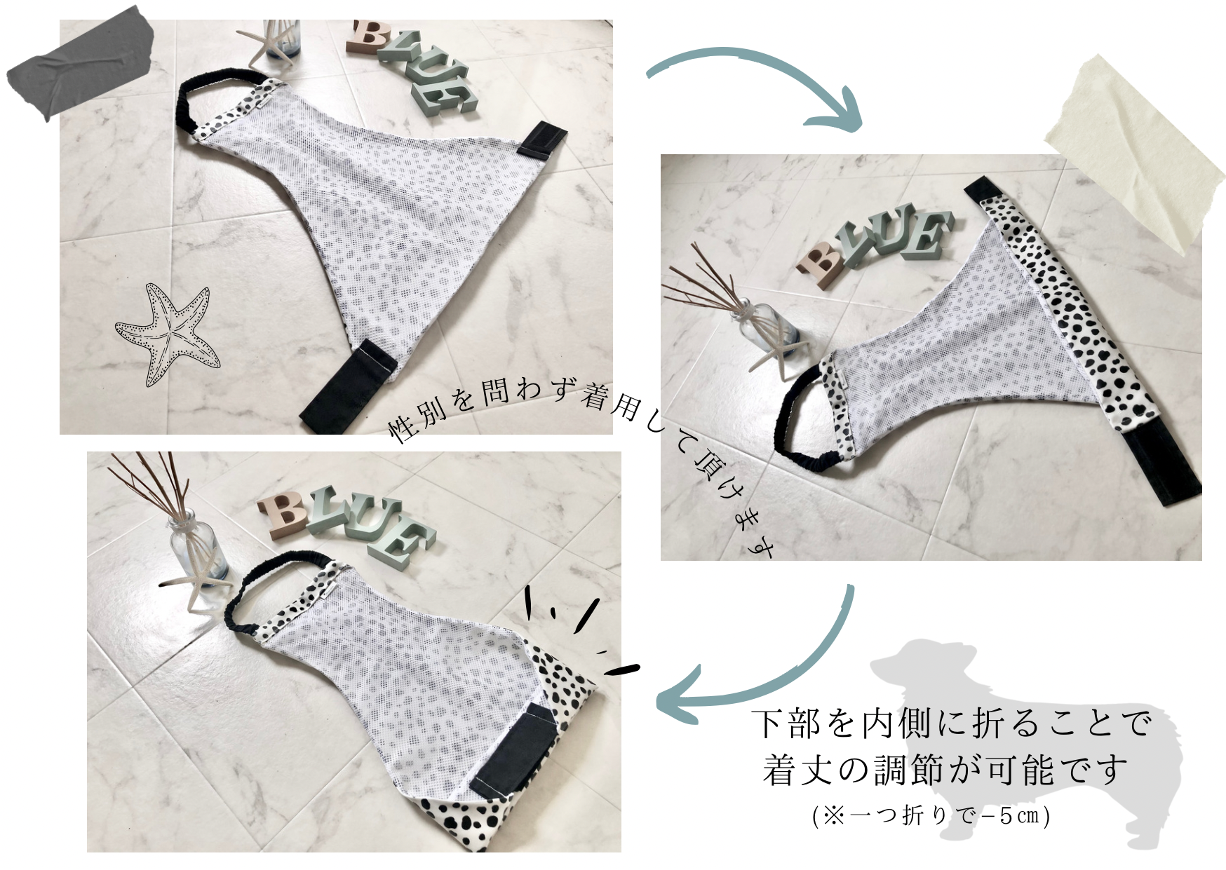 首周りは伸縮性ストラップ、胴周りはマジックテープで留めるだけなので着脱も楽チンです♪