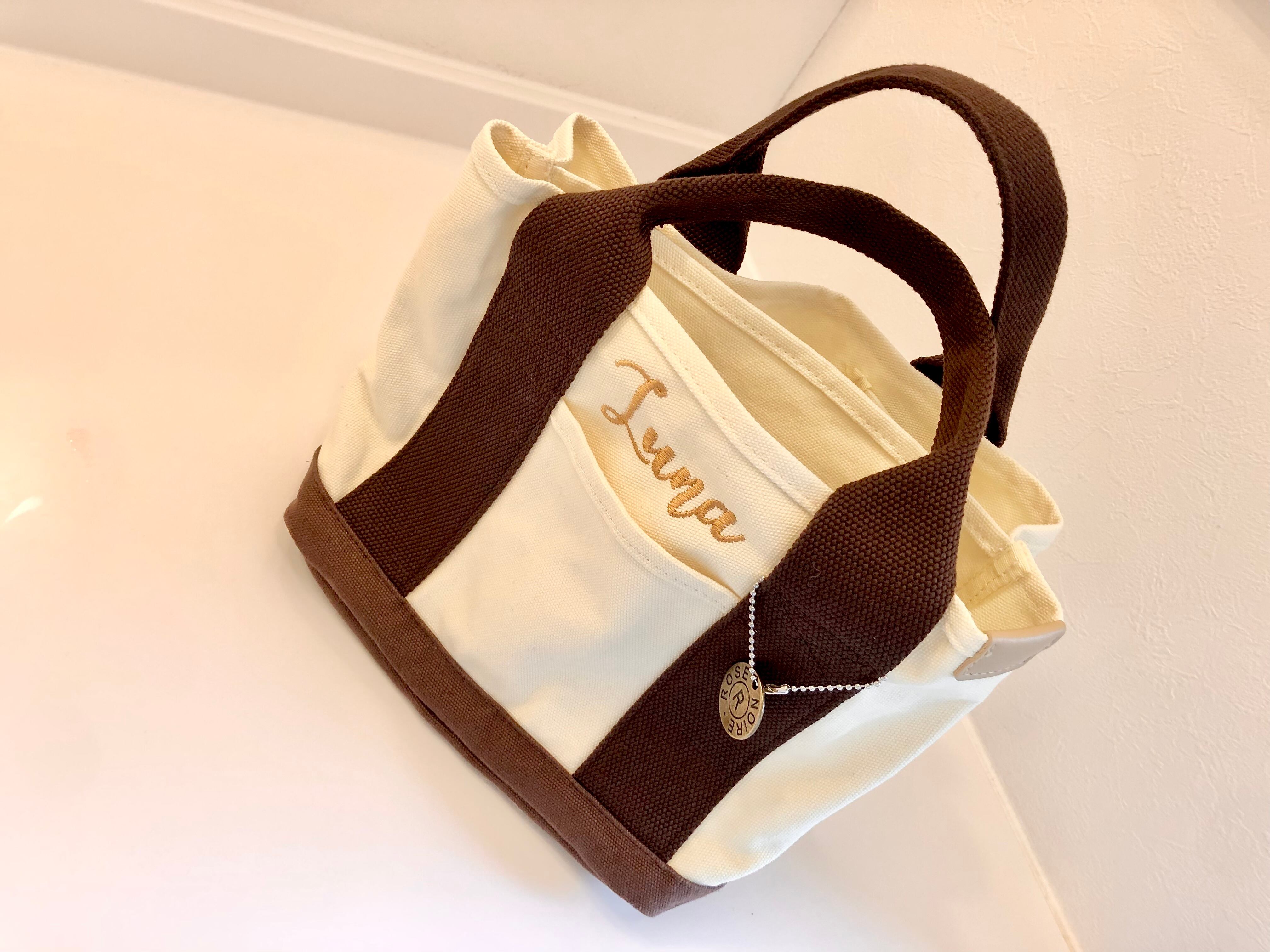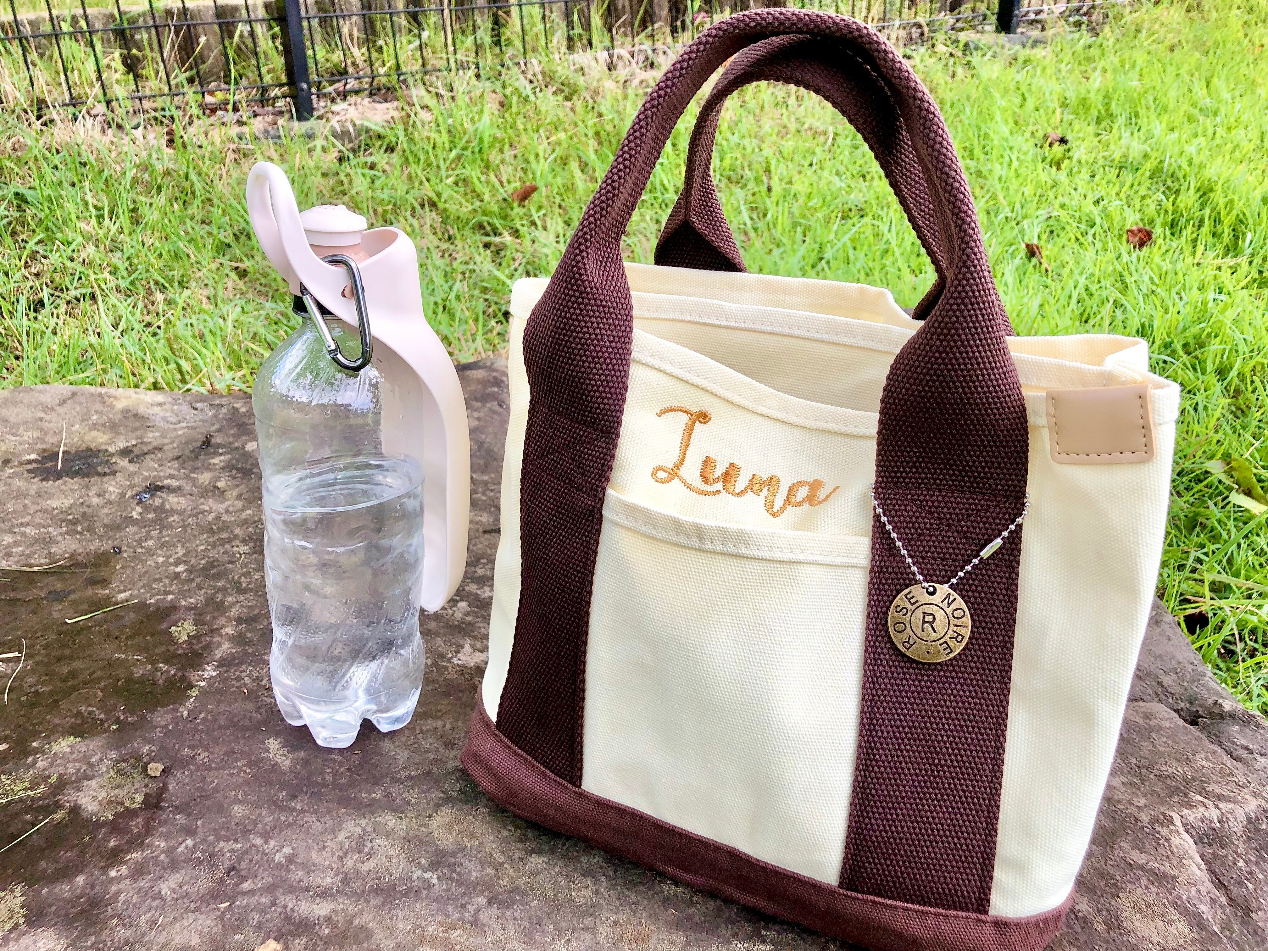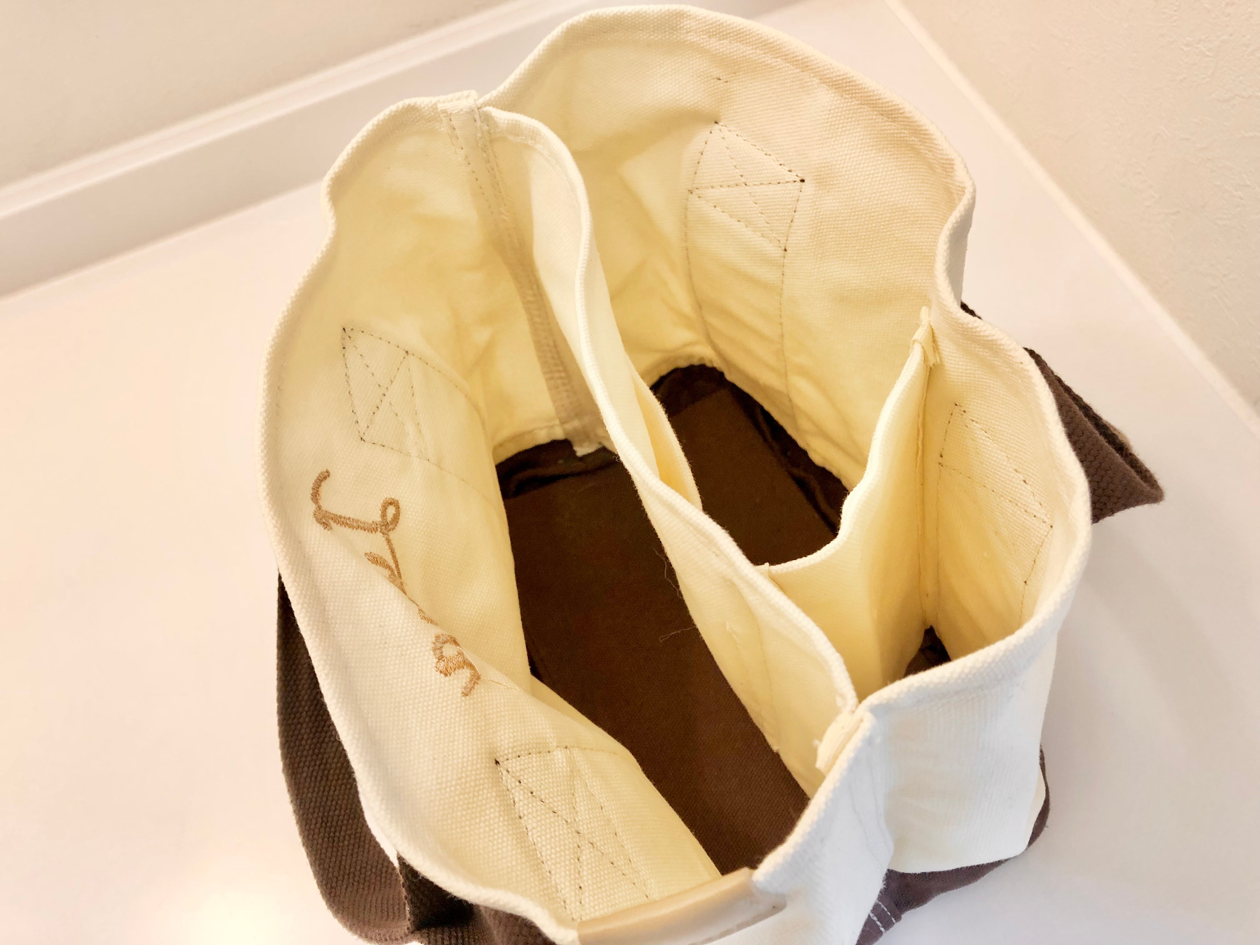 お散歩バッグにちょうどいい刺繍ネーム入りトート。どんな服装にも合わせやすいカラーです。バッグ内は仕切りがついており、中身がかさばらずに取り出しやすい仕様です。