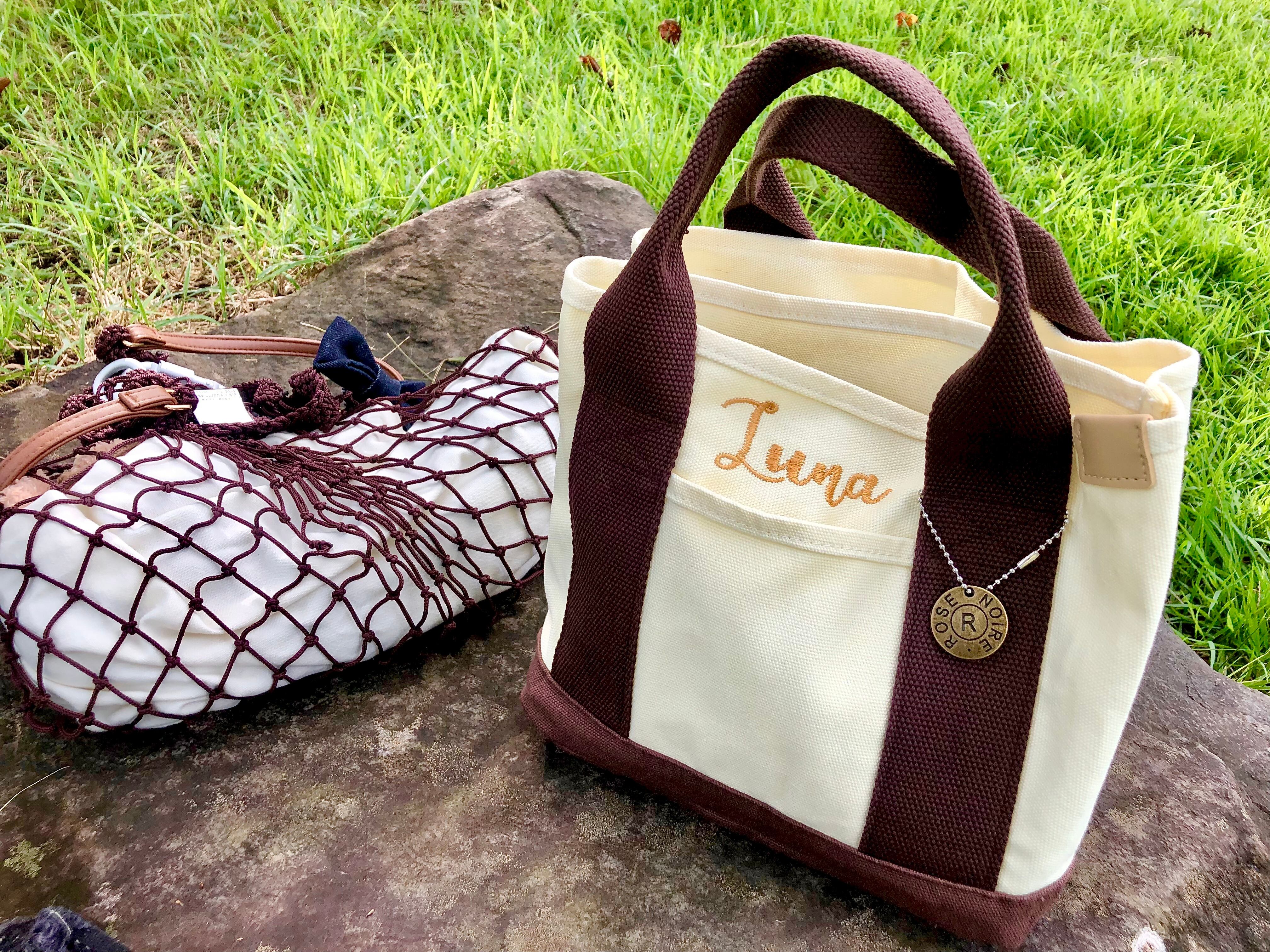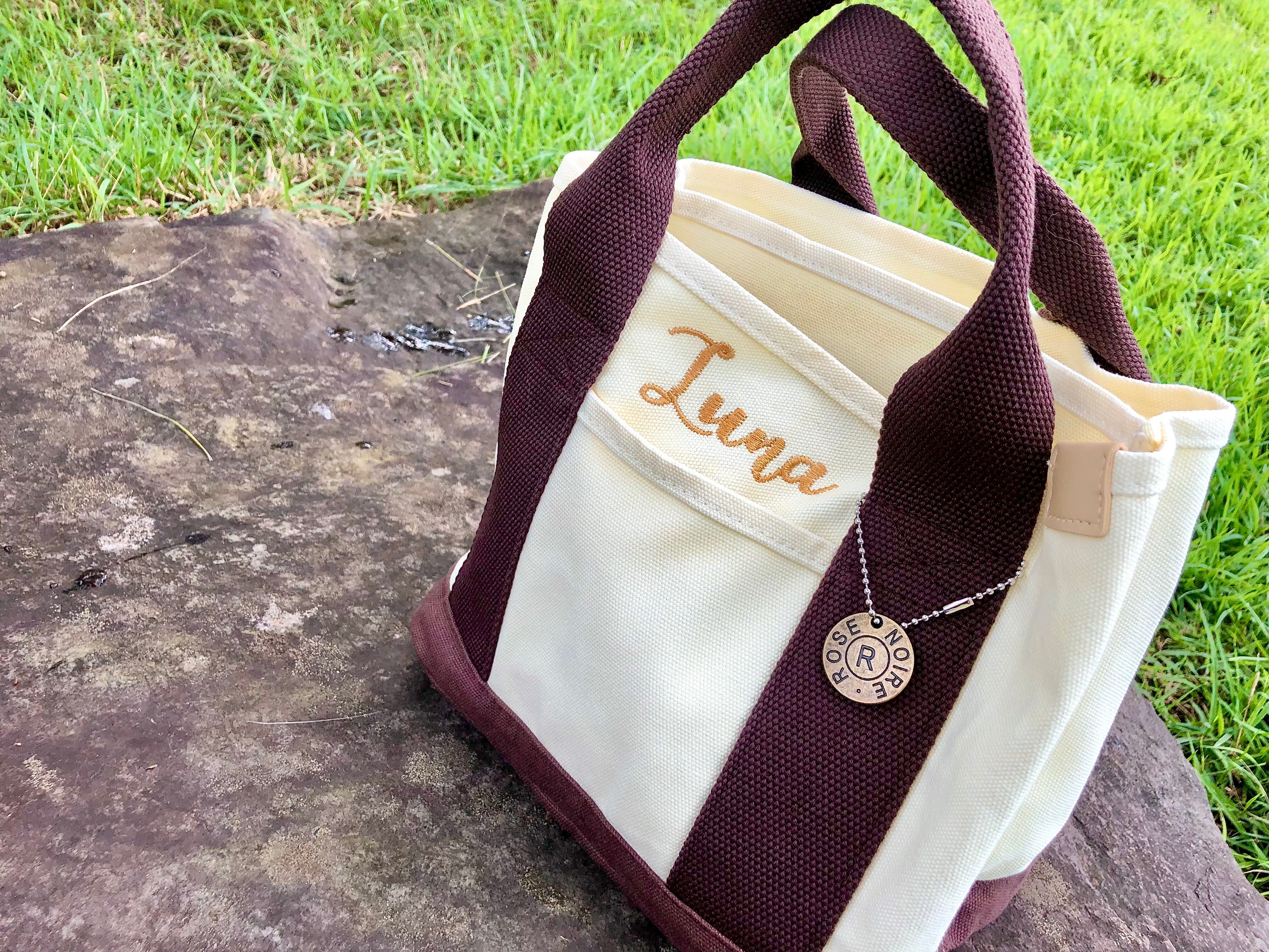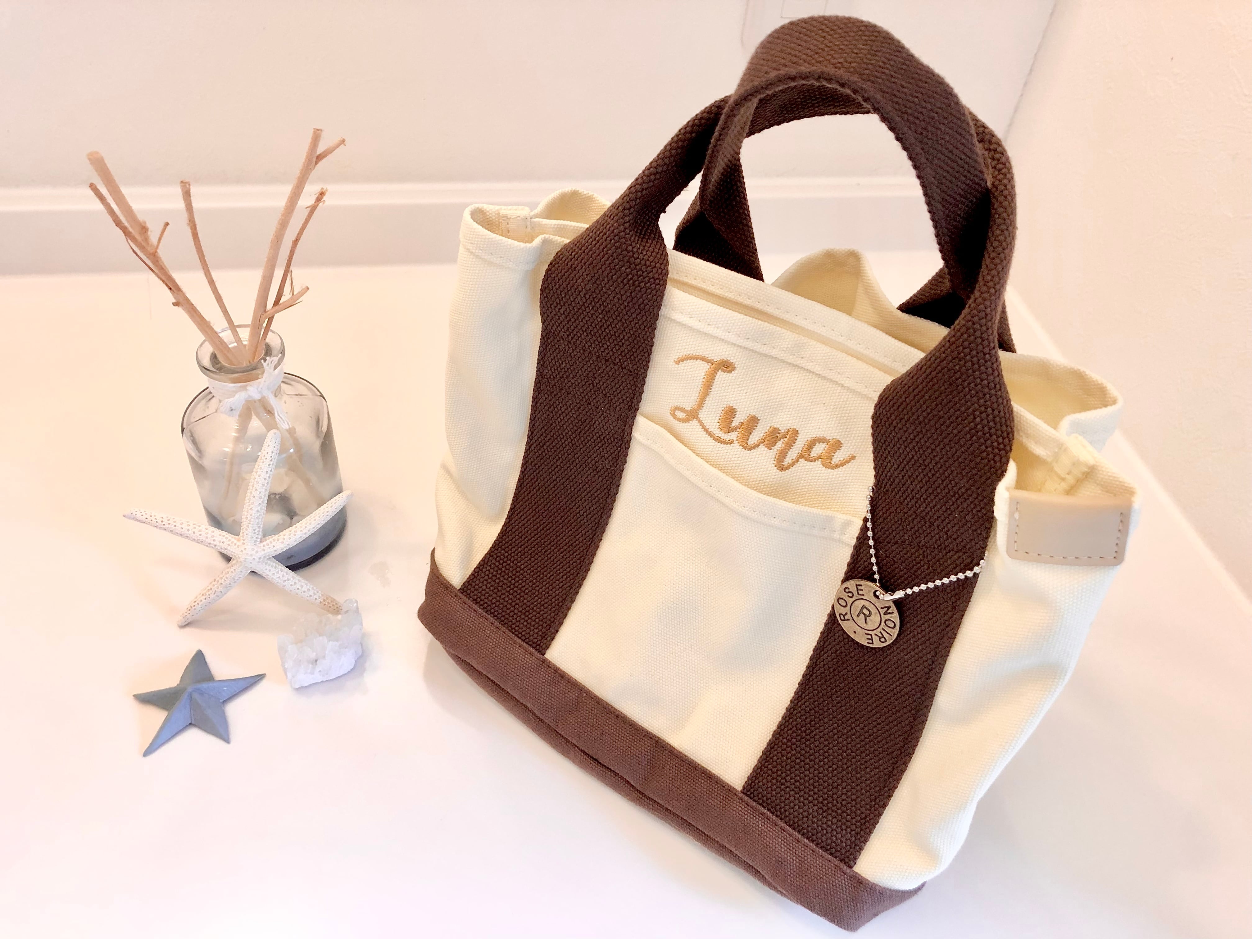 お散歩バッグにちょうどいい刺繍ネーム入りトート。どんな服装にも合わせやすいカラーです。バッグ内は仕切りがついており、中身がかさばらずに取り出しやすい仕様です。