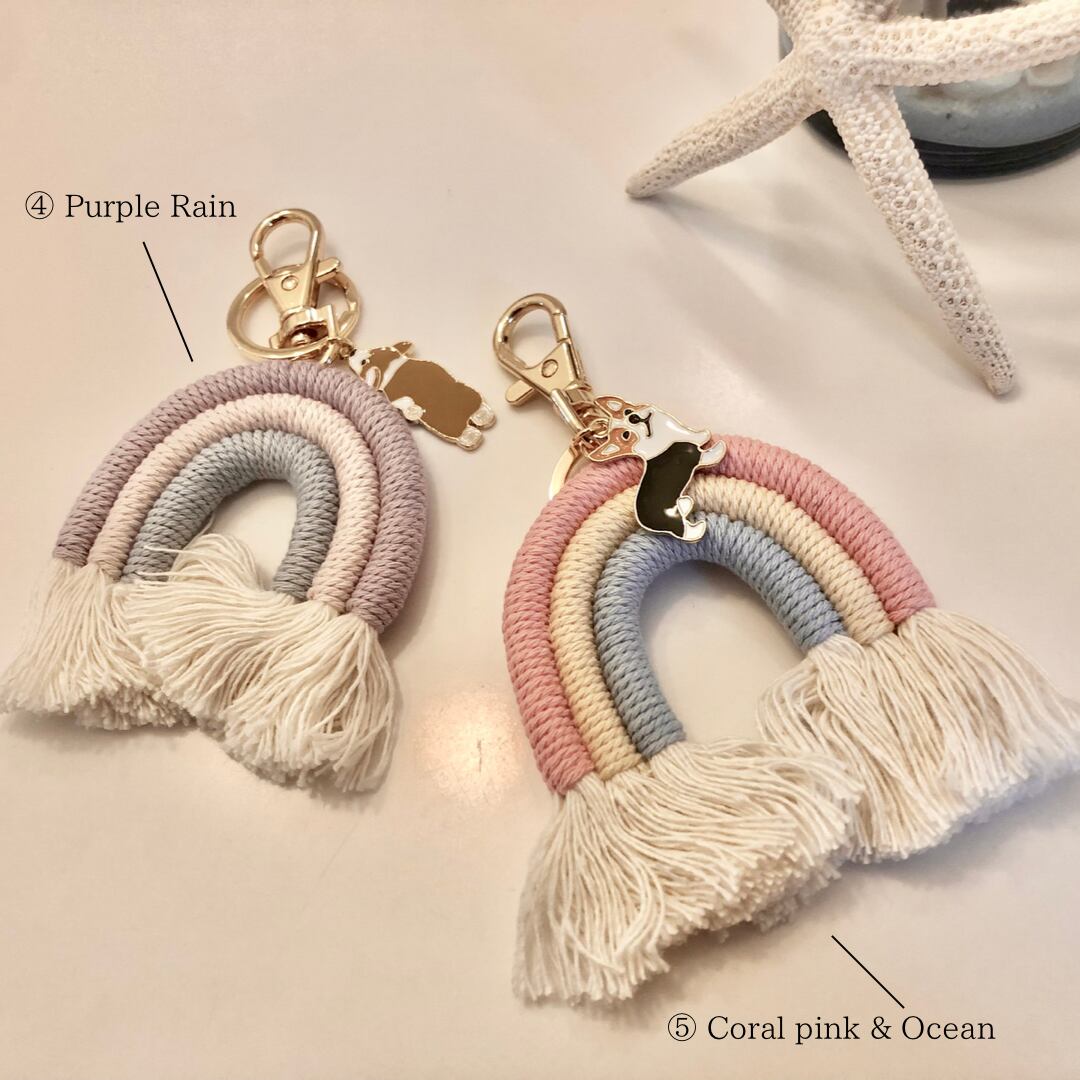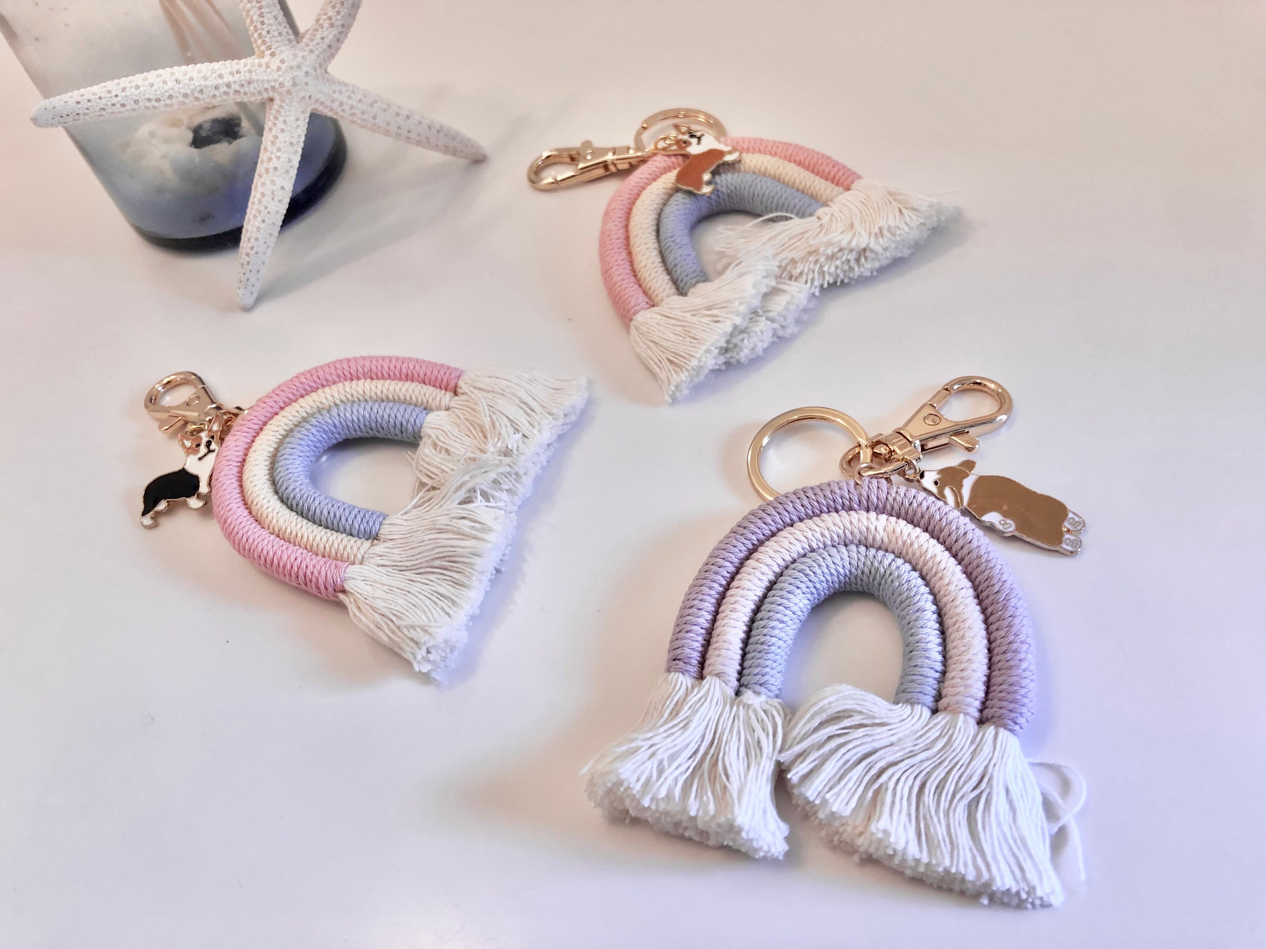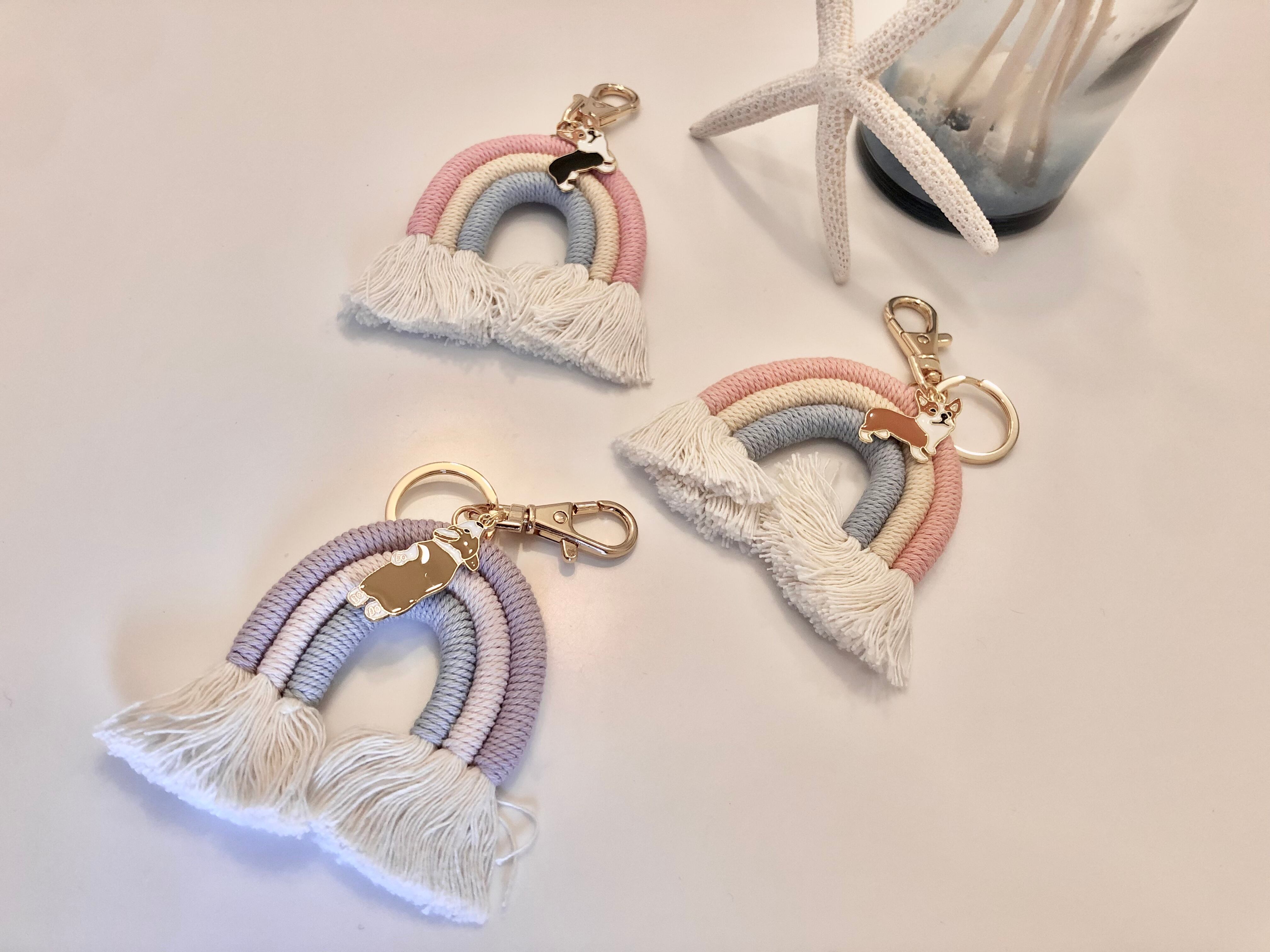そんなマクラメレインボーとコーギーが揺れるキーホルダーです。
