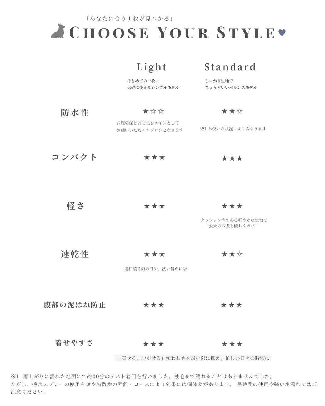 エプロンは雨上がりの日だけでなく、術後カバーや朝露や霜が降りた日、砂浜を歩く際の汚れもガードしてくれます。