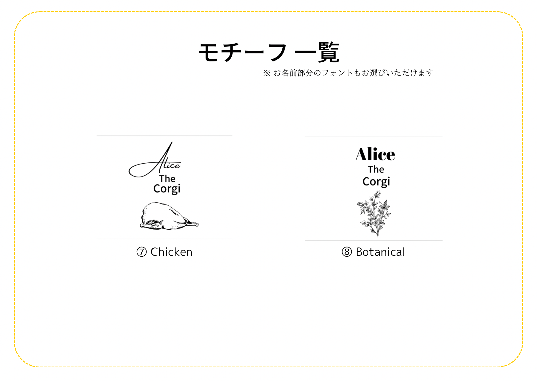 ご希望の方はサンプル画像より、お好きなフォントとモチーフイラストをお選びください。